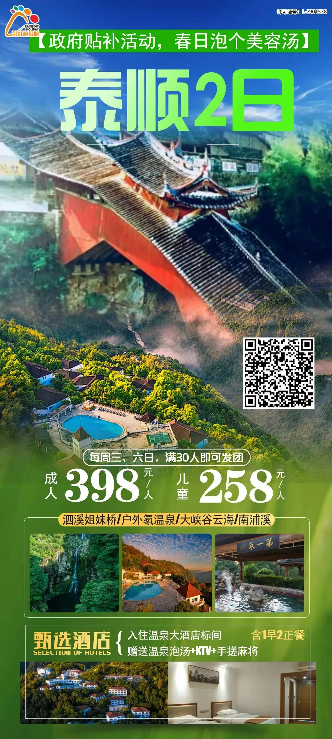 11、【政府贴补活动,春日泡个美容汤】—— 泰顺廊桥、打卡网红南浦溪+油菜花海、入住泰顺温泉酒店(赠送温泉泡汤+KTV+手搓麻将)休闲度假纯玩2日游
