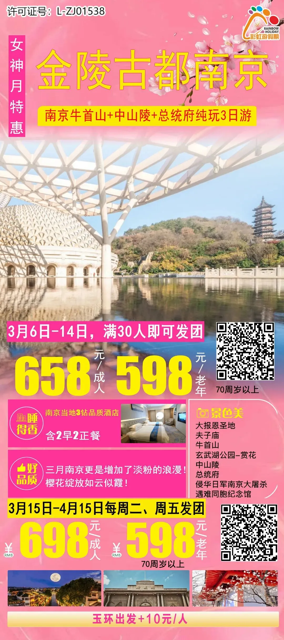 1、女神月特惠【金陵古都南京·踏春游】——南京牛首山+中山陵+总统府纯玩三日游(升级游览大报恩寺,南京大屠杀遇难者同胞纪念馆入内参观)