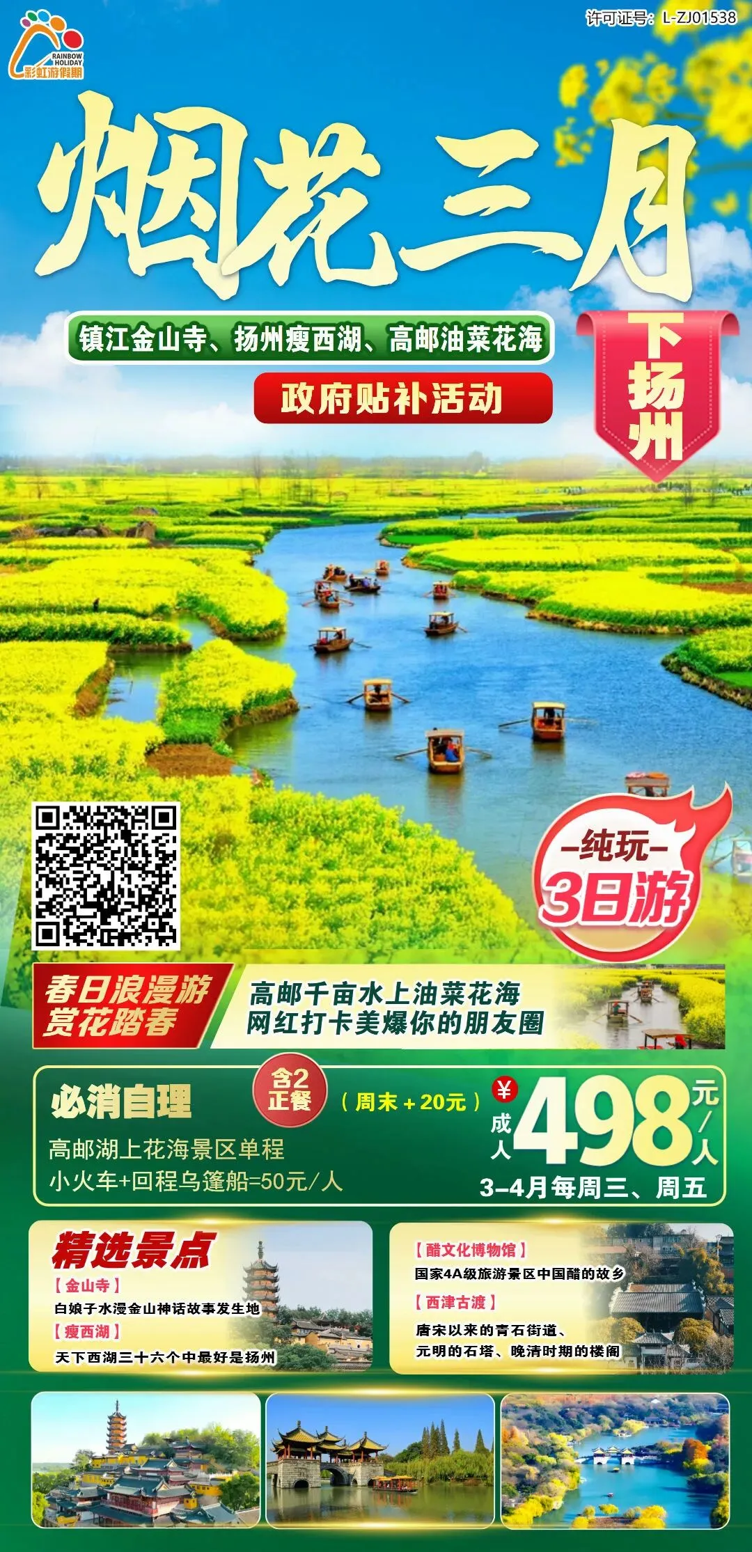 3、【政府贴补活动,烟花三月下扬州】—— 镇江金山寺、扬州瘦西湖、高邮千亩水上油菜花海纯玩3日游