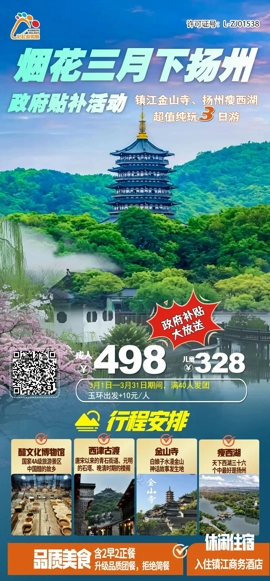 4、政府补贴大放送,真纯玩真实惠 【金山寻春·醋意镇江·诗画扬州】镇江金山寺、扬州瘦西湖超值纯玩三日游