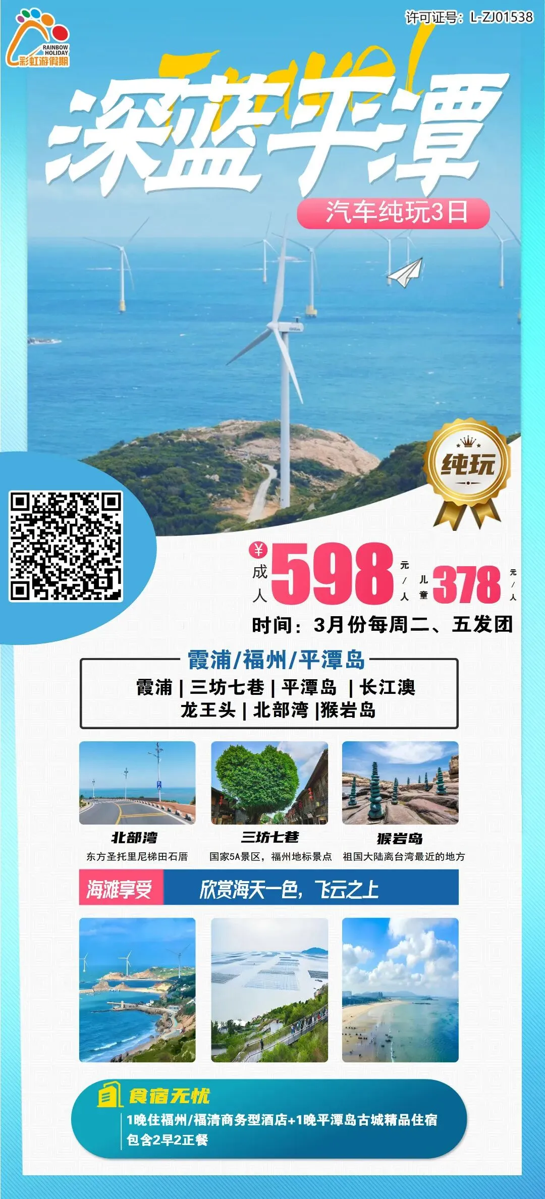5、【深蓝平潭】——福建霞浦东壁观海栈道、福州三坊七巷、打卡平潭岛海岛风纯玩3日游(入住1晚商务酒店+1晚平潭岛精品民宿)