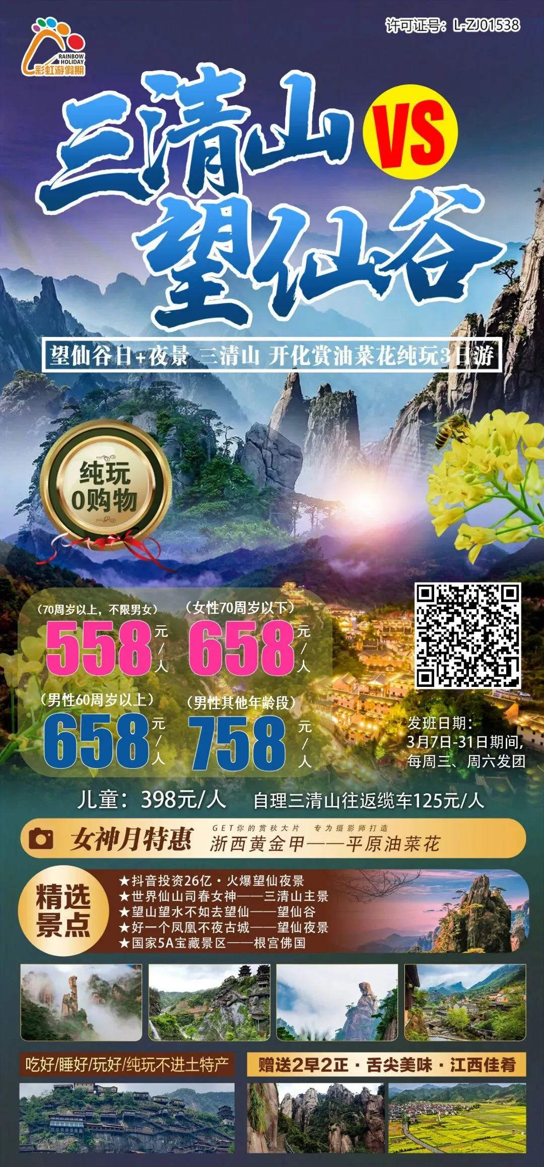7、【上饶双“顶流”:三清VS望仙,女神月特惠】 望仙谷日景+夜景 三清山 开化赏油菜花 纯玩三日游