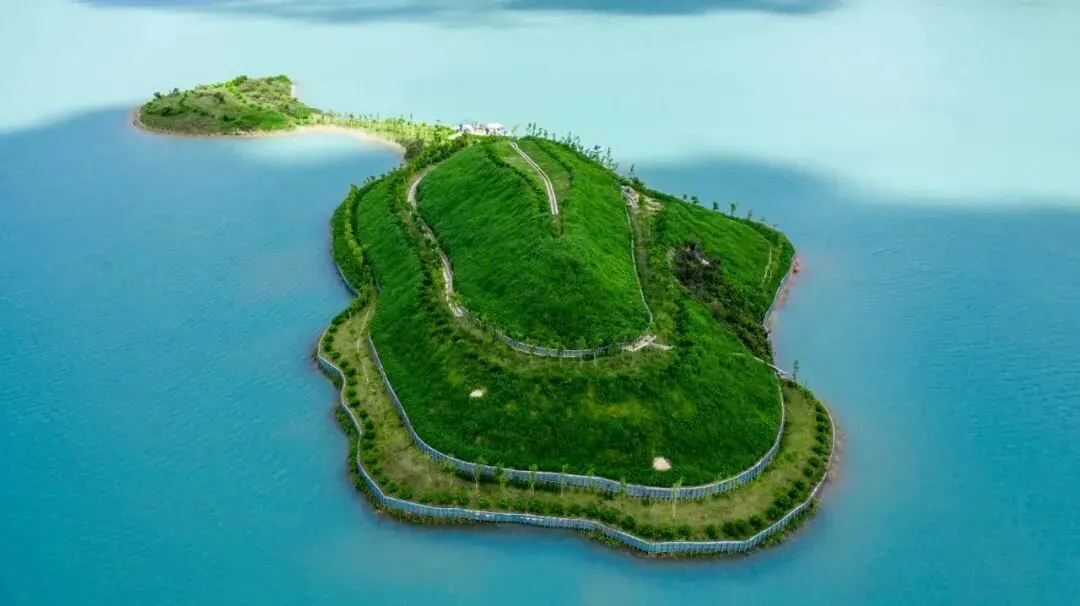 湖心岛上植被茂密,层次分明