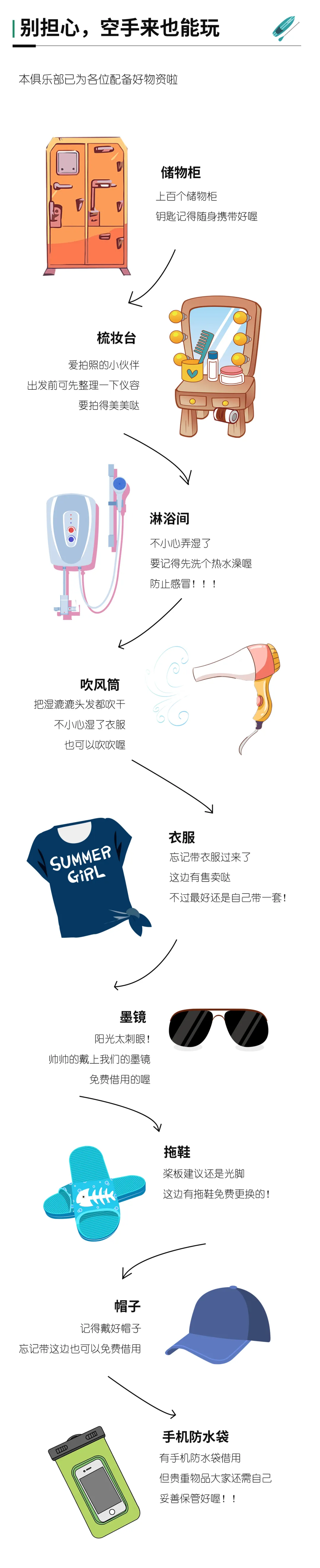 前一晚休息好,切忌熬夜、酗酒。个人装备方面带上换洗衣物、防晒套装、拖鞋or 潜水鞋、还有带上干粮随时可以补充能量。如果你有很棒的 cosplay 道具欢迎带上来一起凹造型,还有脑洞大开的水上玩耍技能!
