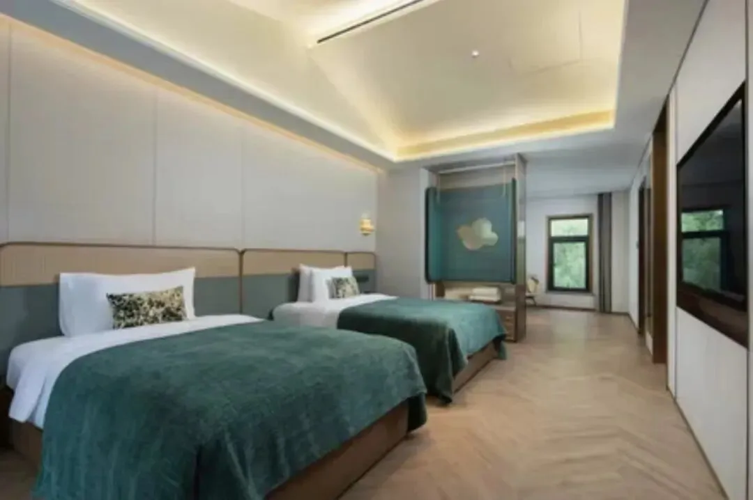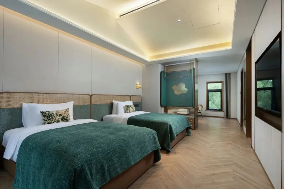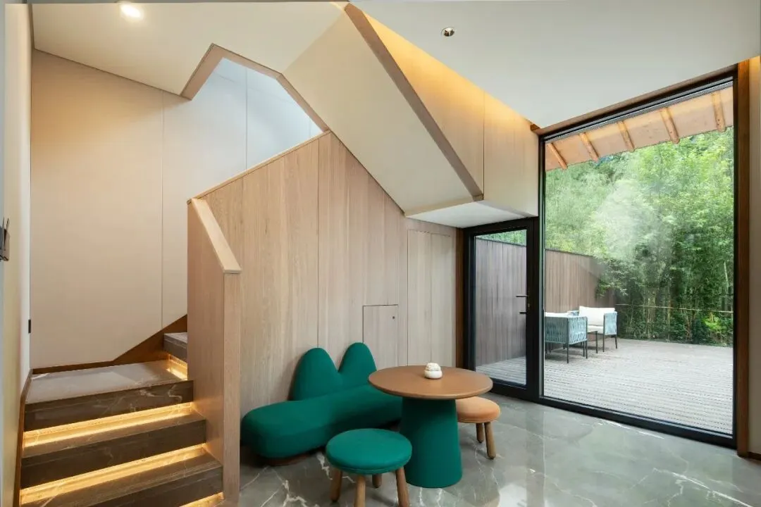 花间境·林隐的每一间客房,都是一座独立的避世小屋。推门而入,是温润的原木色调,阳光透过落地窗洒在木地板上,光影斑驳。