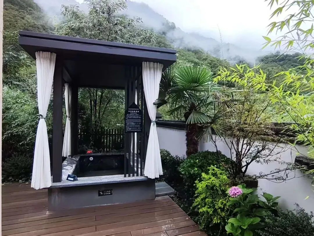 每个独立小院都藏着一份私密的心意——引自地底深处的天然秦岭山温泉水,正氤氲着热气等你。