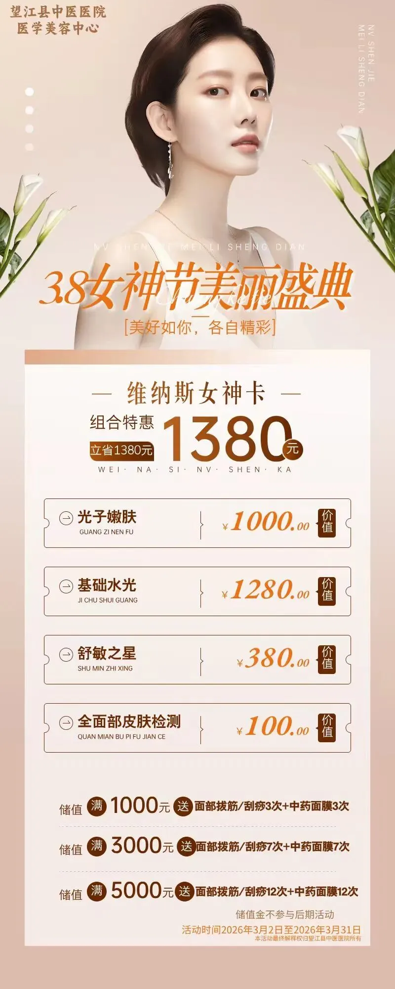 当前位置:首页>美女资讯>3·8女神节美丽盛典 | 价值2780元维纳斯女神卡超值特惠1380元,更有充值赠送叠加优惠!