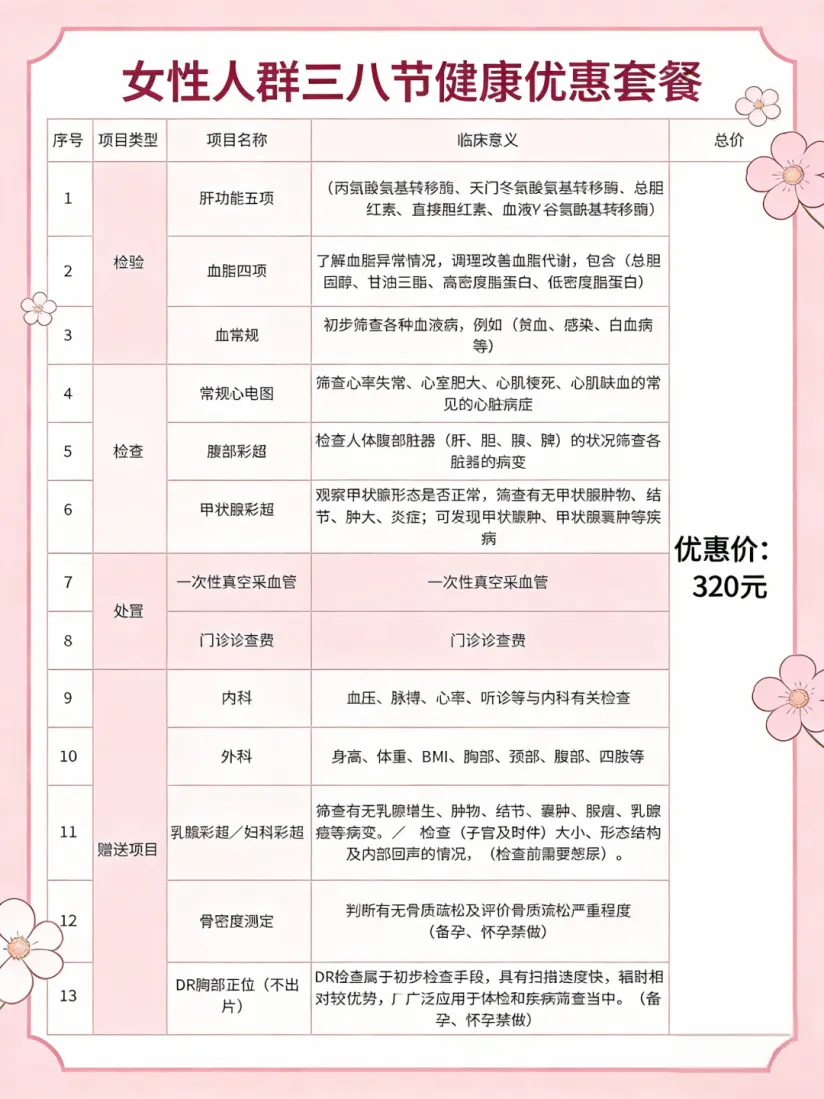 科室特别推出3·8女神节专属体检优惠套餐,精准筛查、贴心守护、价格直降,把健康送给自己、送给妈妈、送给身边最重要的人。