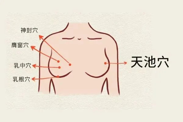 属心包经,在乳头外上方一寸,第 4、5 肋间隙,也是乳腺健康重点区域。