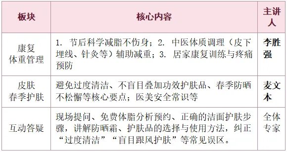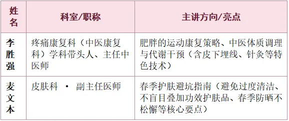 注:李胜强主任将从康复医学与中医治未病角度,系统讲解春节后体重管理与代谢调理;麦文本主任则聚焦皮肤健康,内容包括常见皮肤疾病防治、日常护肤步骤。