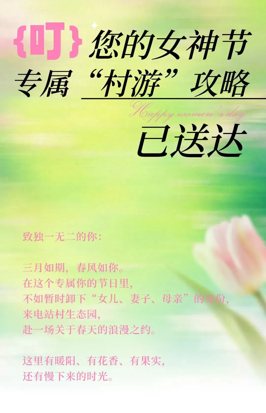 活动内容:三月如期,春风如你,在这个专属你的节日里,来电站村生态园,这里有暖阳、有花香、有果实,赴一场关于春天的浪漫之约。
