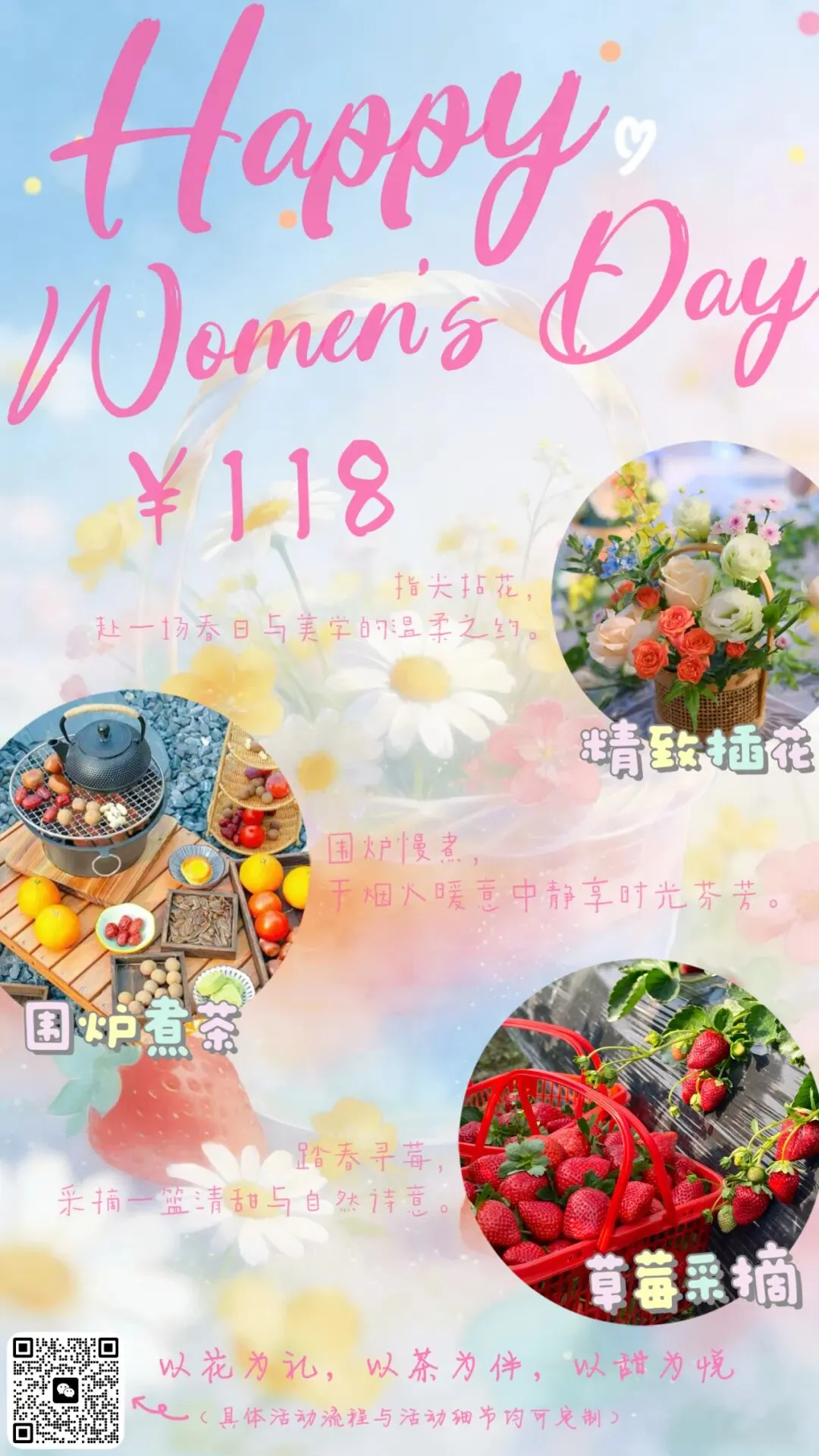 2.推出六个女神节套餐:花间恩钿、花容月色、花韵悠长、花馨雅集、花朝盛宴、花样年华,价格为98元至138元,将仓宝趣生活系列活动、花卉科普研学及水果采摘等进行串联,向企事业单位提供定制化活动。