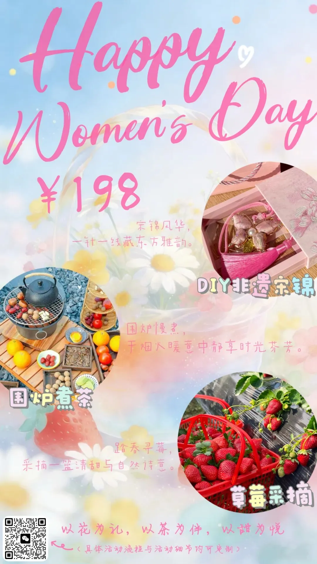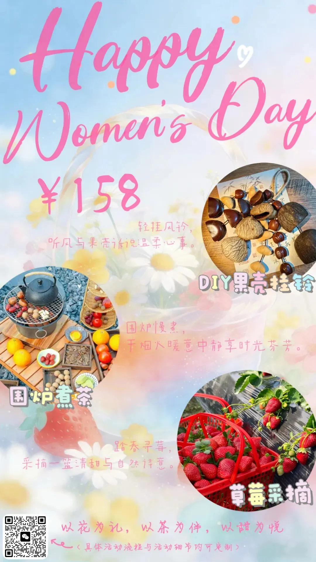 活动内容:3月5日至15日准备草莓采摘、手工雪媚娘、手工水晶树、非遗螺钿胸针等妇女节专属活动。拒绝千篇一律,备好趣味手工盛宴,诚邀赴约。