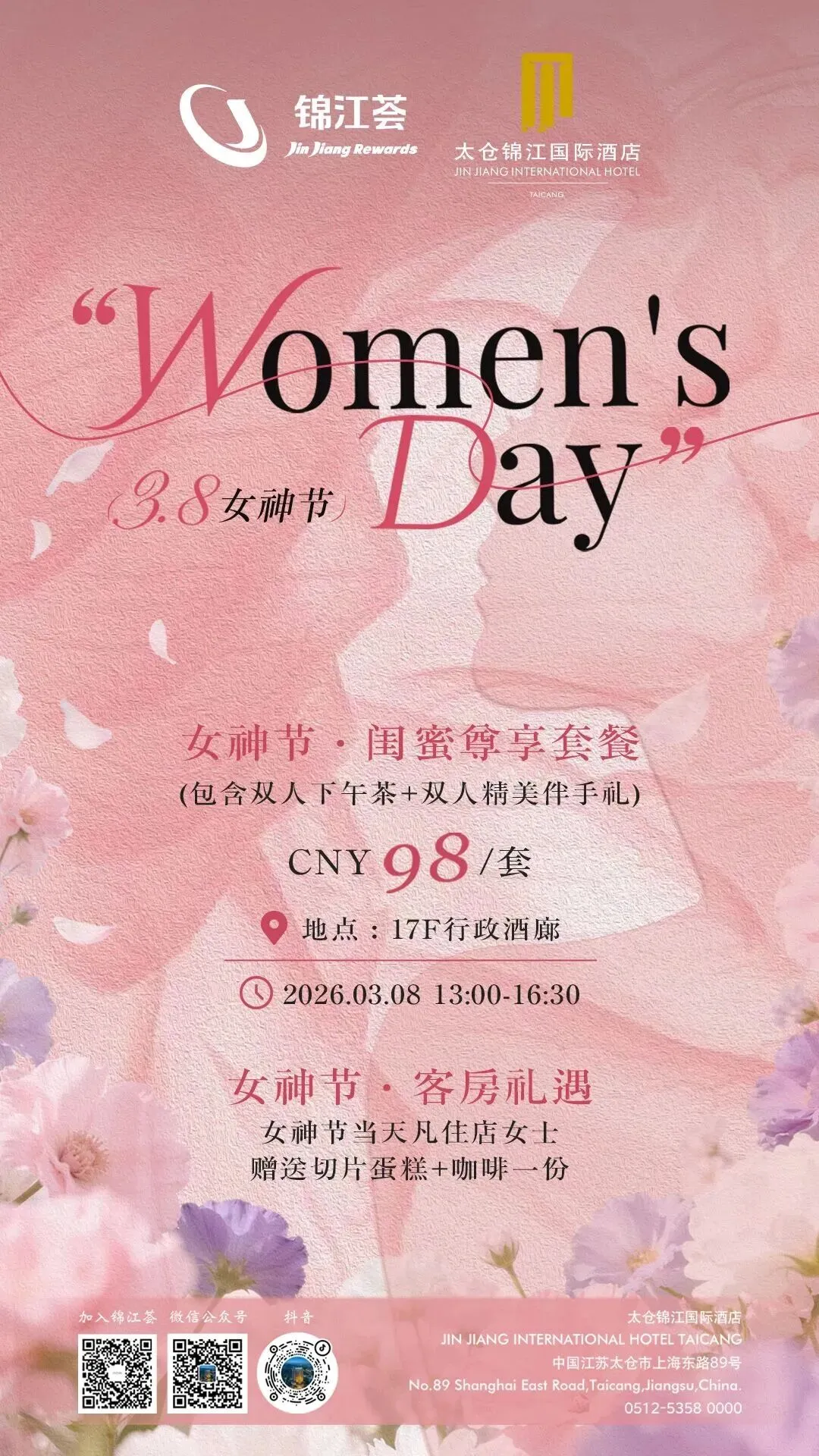 活动内容:餐厅零点女性客人,除可以38元享受女神节专享甜品外,可获赠一支玫瑰花。