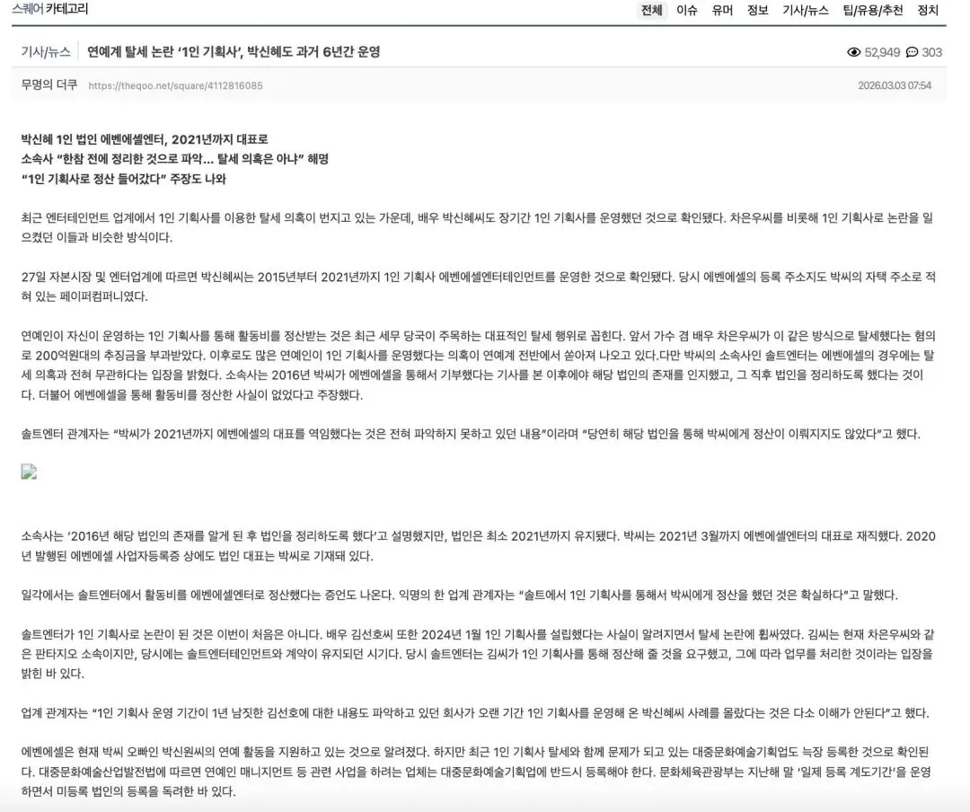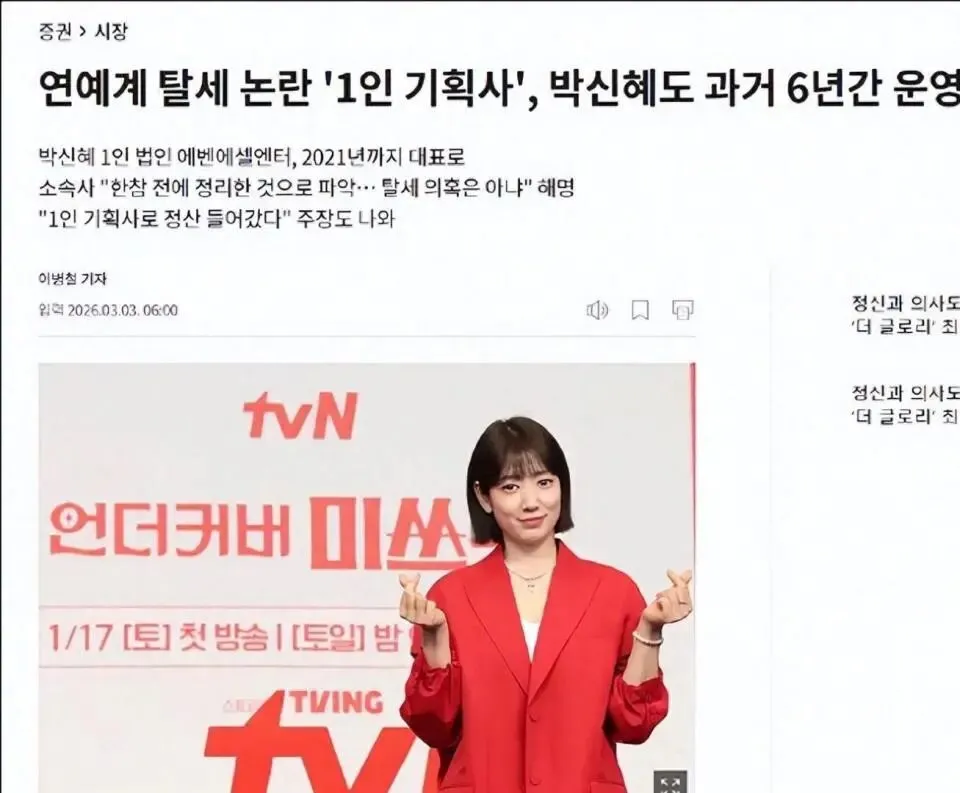 这一消息瞬间点燃了网络。由于正值韩国国税厅将艺人“一人企划社”列为重点稽查对象,且国会正研讨针对性法规的敏感时期,朴信惠的卷入无疑触动了大众最敏感的神经。