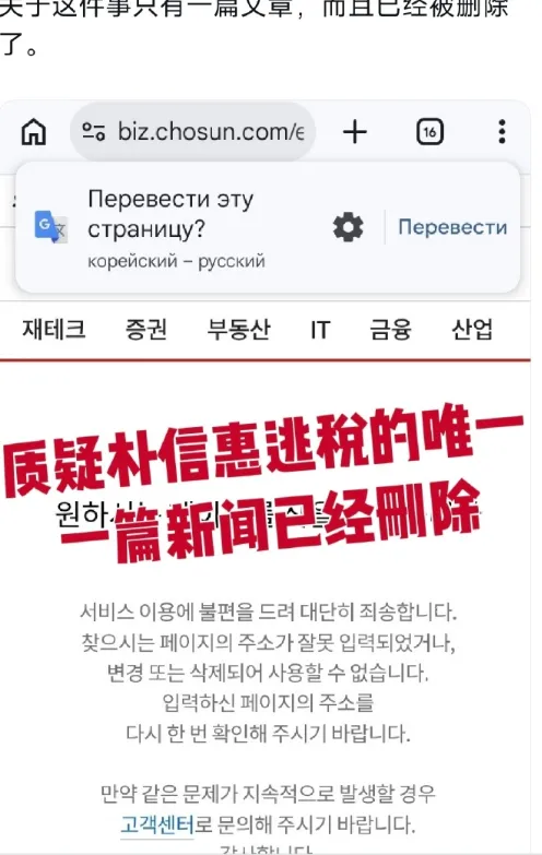 与此同时,事件中最具戏剧性的一幕出现了:《朝鲜日报》官网上的原始报道悄然被下架删除。