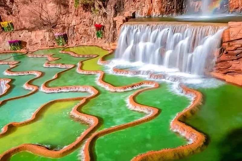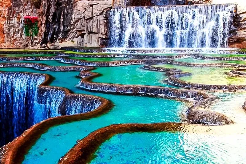 七彩池是由大大小小的水池组成,所有的池水来自同一条瀑布,水流到各个水池里,颜色却不同了。池边由金黄色的石粉凝结而成,像一圈圈彩带,把大大小小的水地围成各种不同的形状,有像葫芦的,有镰刀的,有像月牙的,有像盘子的,有像莲花的……