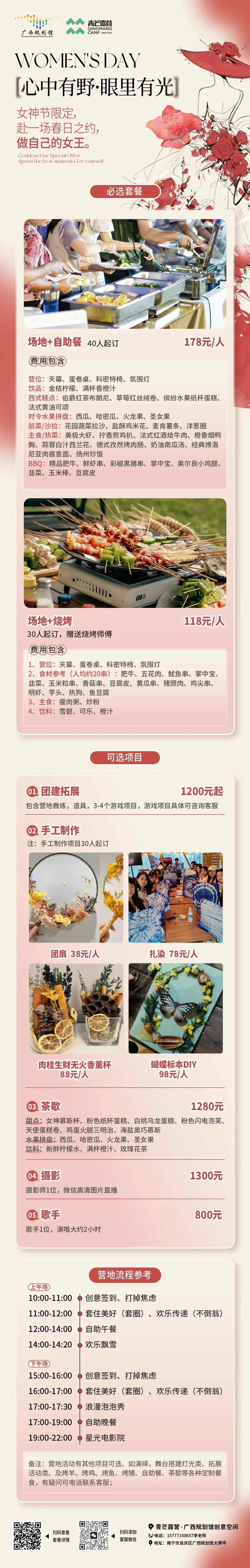📞预约咨询:可提前致电或扫码咨询露营套餐、场地预约及“三八”妇女节专属福利详情