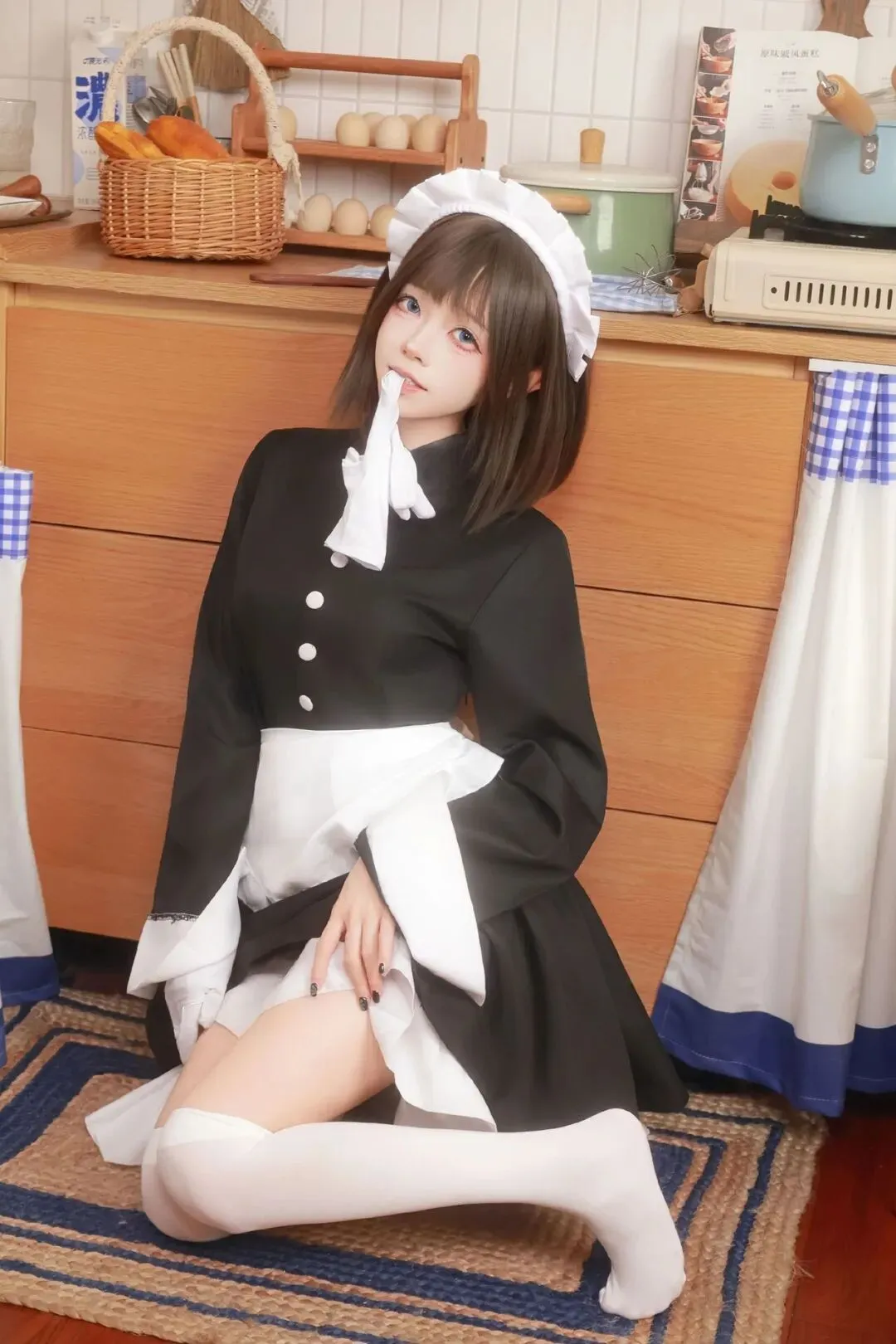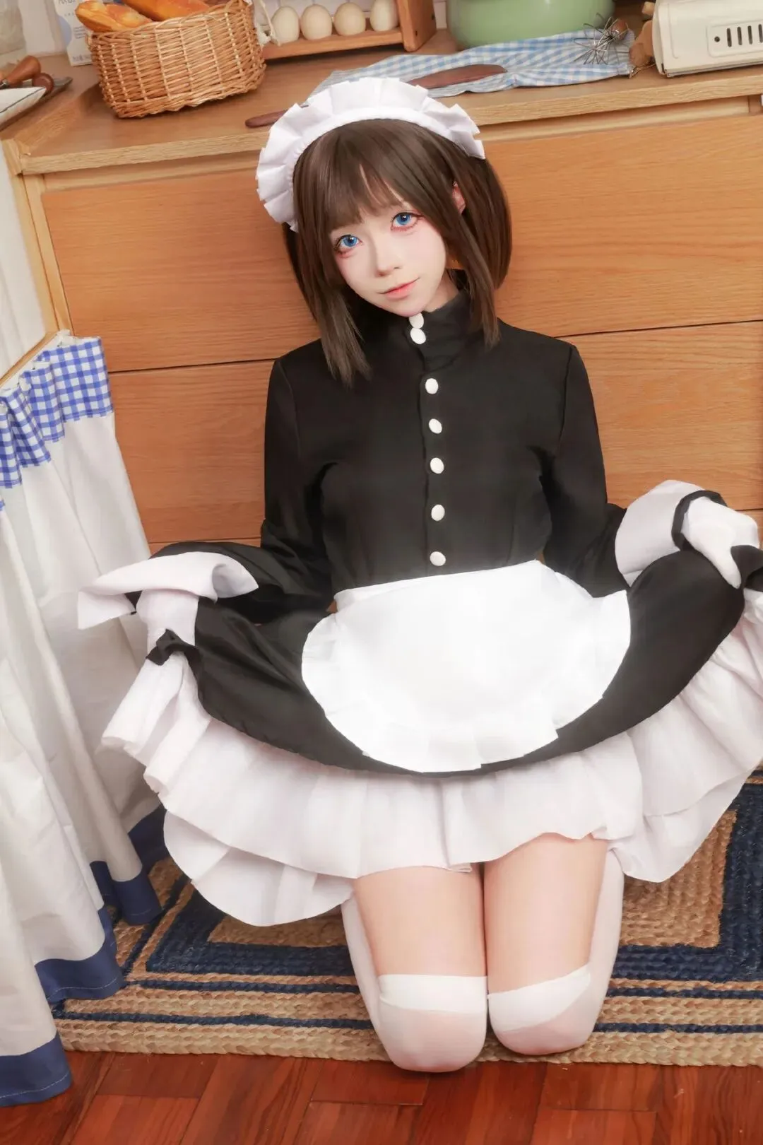 推开那扇通往治愈世界的门,木质橱柜的暖棕色调在眼前铺展开来。编织篮里的法棍面包泛着麦香的光泽,仿佛刚从烤箱里取出还带着余温。鸡蛋架上排列整齐的蛋壳带着温润的质感,像是被精心呵护的珍宝。蓝白格纹布随意搭在台面上,旁边的木质锅铲和打蛋器安静地立着,像是刚被人随手放下的生活碎片。在这样充满烟火气的复古日系厨房里,一位身着黑白女仆装的少女悄然出现。她的齐肩短发带着自然的弧度,齐刘海下的眼眸像是揉碎了深海的蓝,清透又带着一丝狡黠。当她跪坐在铺着编织地毯的地板上时,整个空间的节奏都慢了下来。日常的喧嚣被隔绝在门外,只剩下木质纹理的温柔和少女身上散发出的柔软气息,让人忍不住想要停下脚步,沉浸在这片刻的治愈里。
