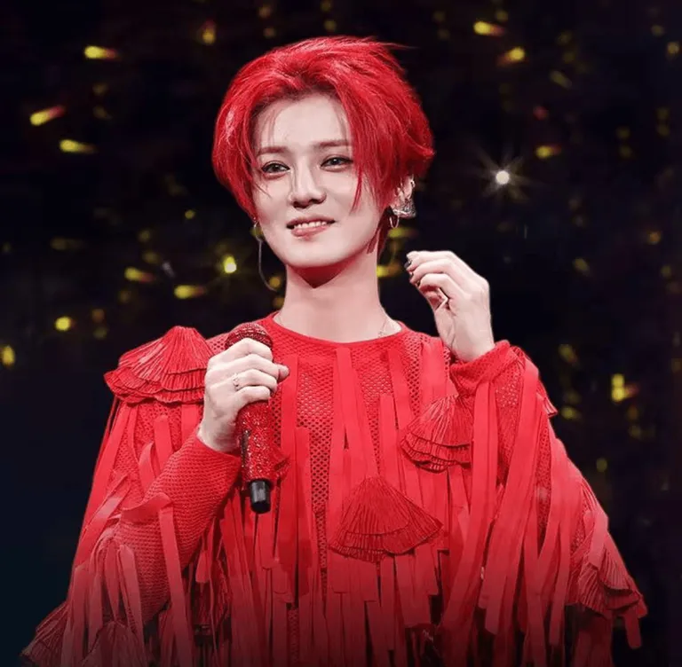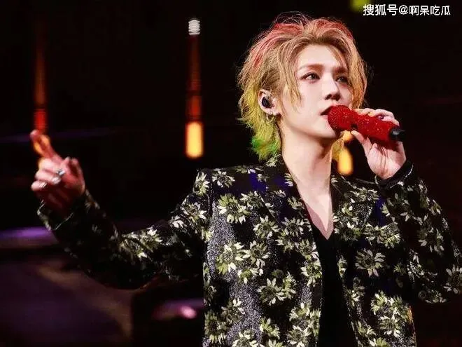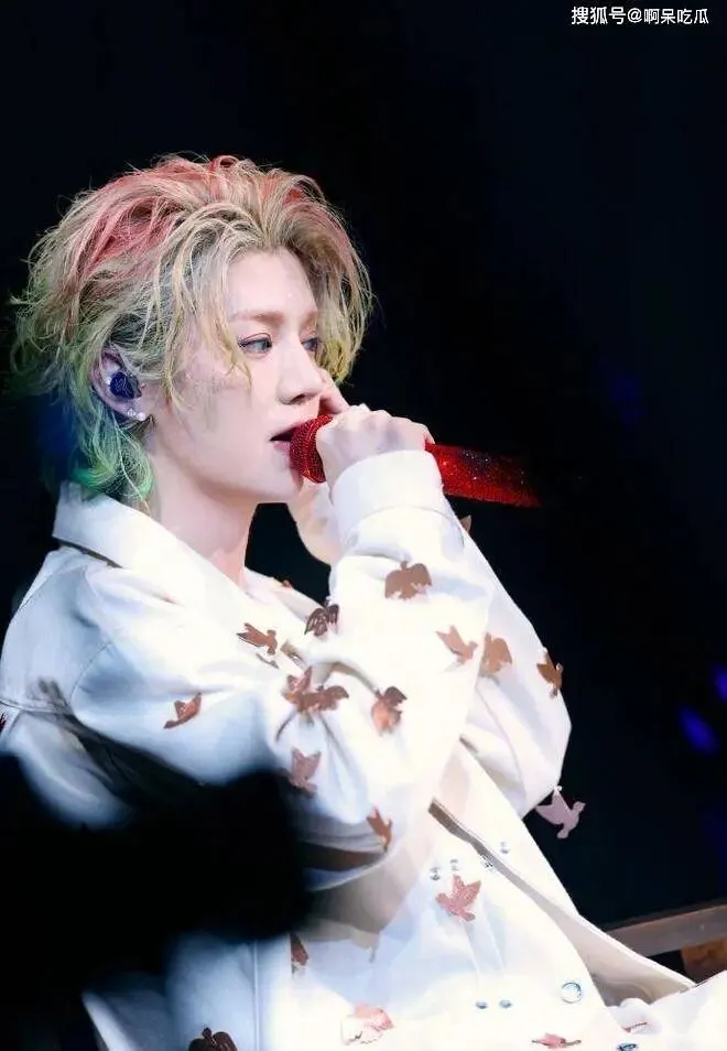 金色与墨绿交织的发色如打翻的调色盘,在舞台暗调背景中迸发出前卫的生命力。他手握猩红麦克风,黑色耳返连接着音乐脉搏,黄黑纹样的西装像是把毕加索的抽象画穿在身上——这是艺术家与舞台的共谋,用夸张的造型宣告:时尚本就是一场行为艺术。