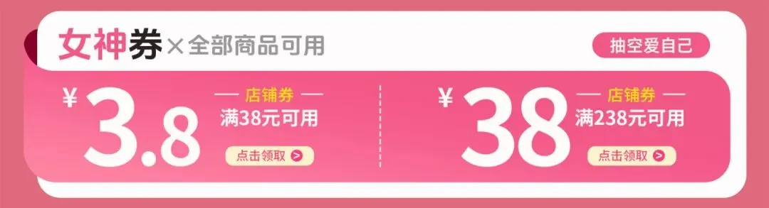 专属宠爱,无需等待!3.8女神券限时发放,全场通用,让你轻松入手心仪好物,不用精打细算,每一份喜欢都能轻松拥有,把宠爱藏在每一笔划算的消费里~