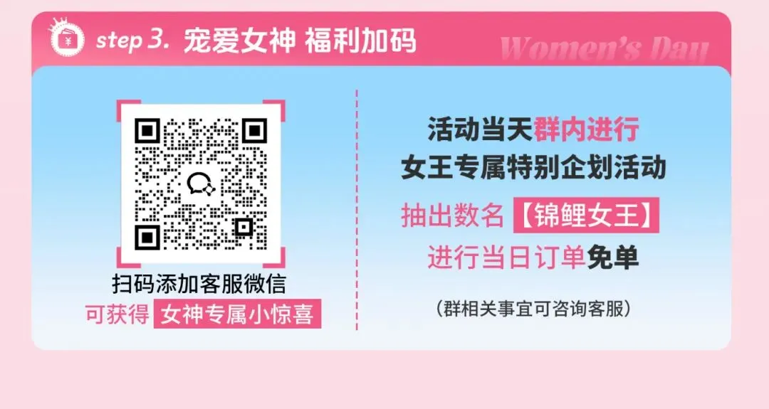 2. 活动当天,群内开启【女王专属特别企划】,随机抽出数名【锦鲤女王】,享受当日订单全额免单福利,承包你一整天的快乐与惊喜!
