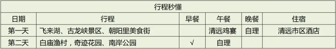 08:00—11:00 早上游客于指点地点集合,前往中国优秀旅游城市—清远市11:00—12:00前往【飞来湖湿地公园】游览清远市第一个开放式公园-清远飞来湖湿地公园位于清远市清城区中部。该景区为“一桥、两塔、三湖区”。一桥即将桥北路跨湖段改造为景观大桥,绿化略后退,突桥体流畅美观的造型;两塔分为南塔、北塔,创造了观桥的最佳位置,同时自身也成为公园的景观重点使平面的公园景观更具有空间立体感;三湖区为星光湖区、月牙湖区、阳光湖区,不同的水面造型景观台,兼顾码头功能,同时赋予三个湖区各自独特的含义。