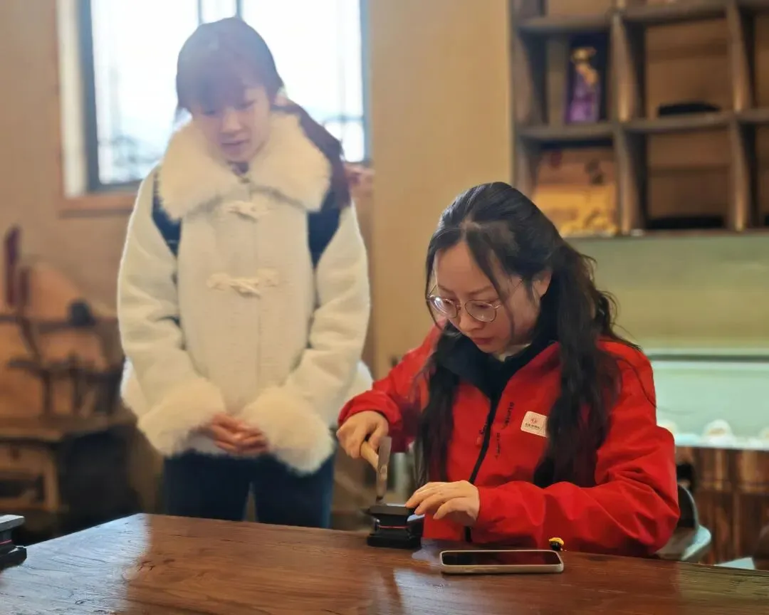 活力健身操结束后,大家来到非遗手工体验坊。坊内有古法榨油、手工花馍、织布、香囊制作和银器制作等项目,还有五谷画创作、石磨豆腐制作等古法手工技艺。