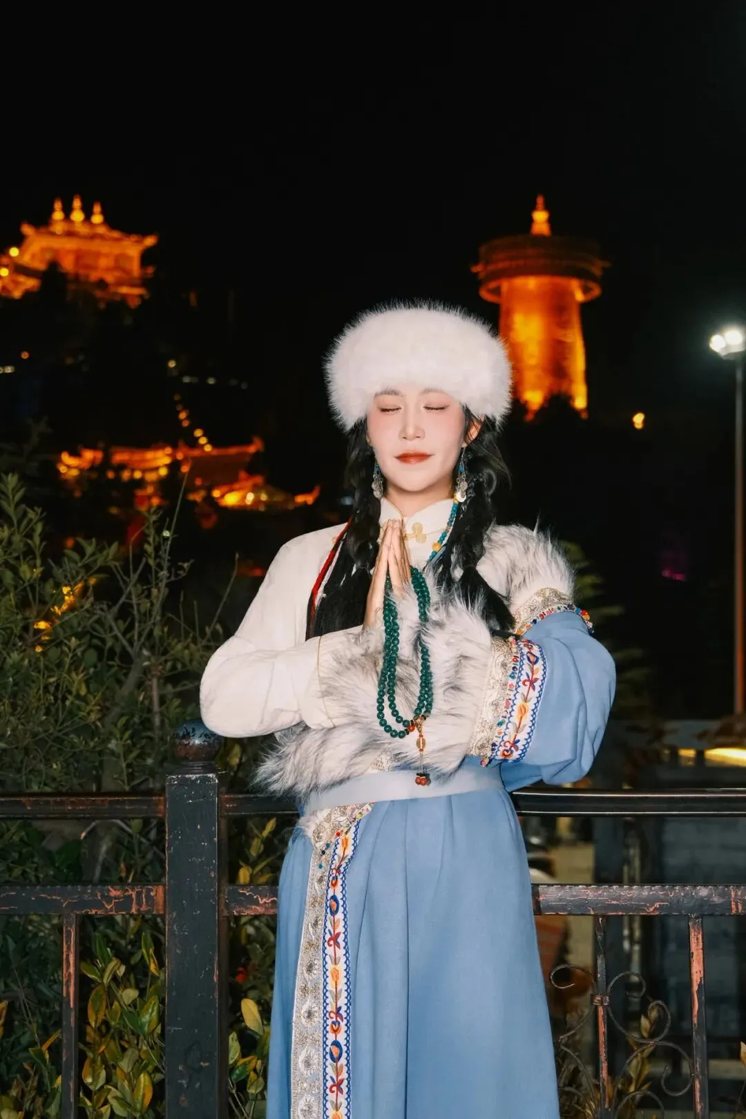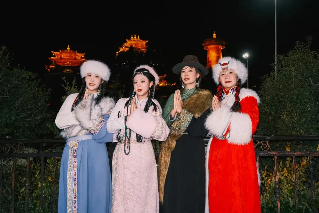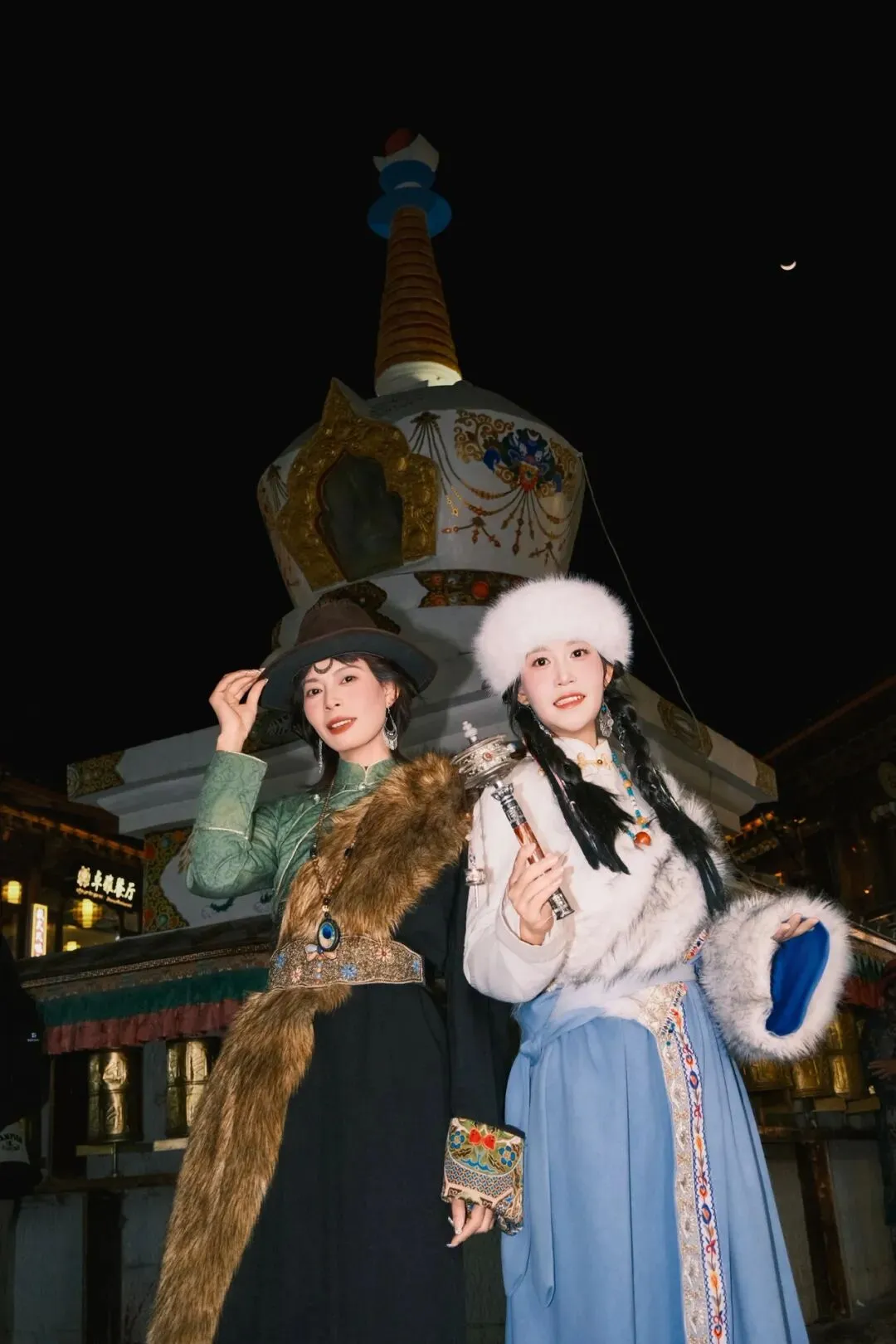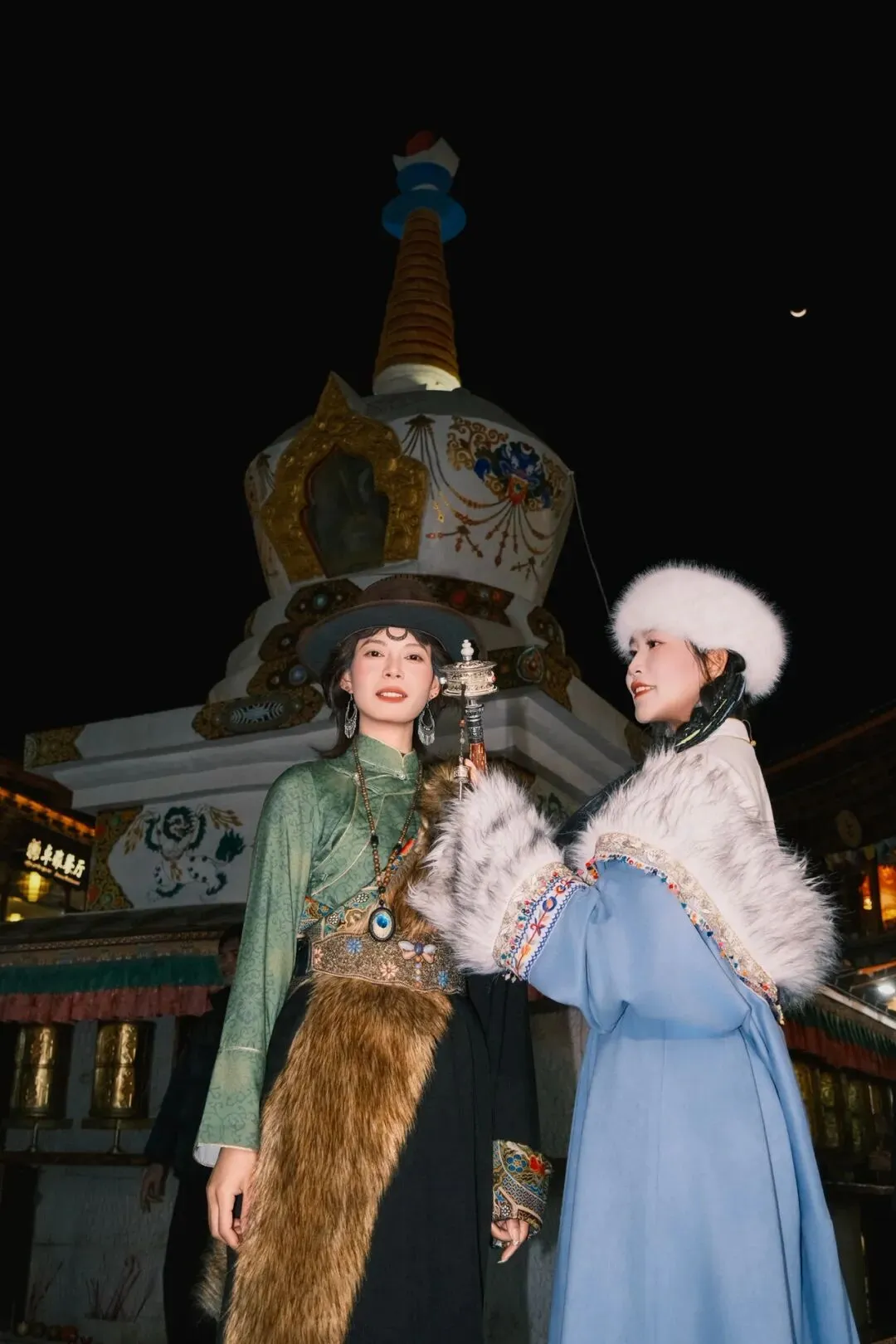 我们站在白塔前,身后是灯火摇曳的藏式建筑,月牙钩悬于天际,转经筒轻响,这一刻,传统与现代交融,信仰与美学共生。