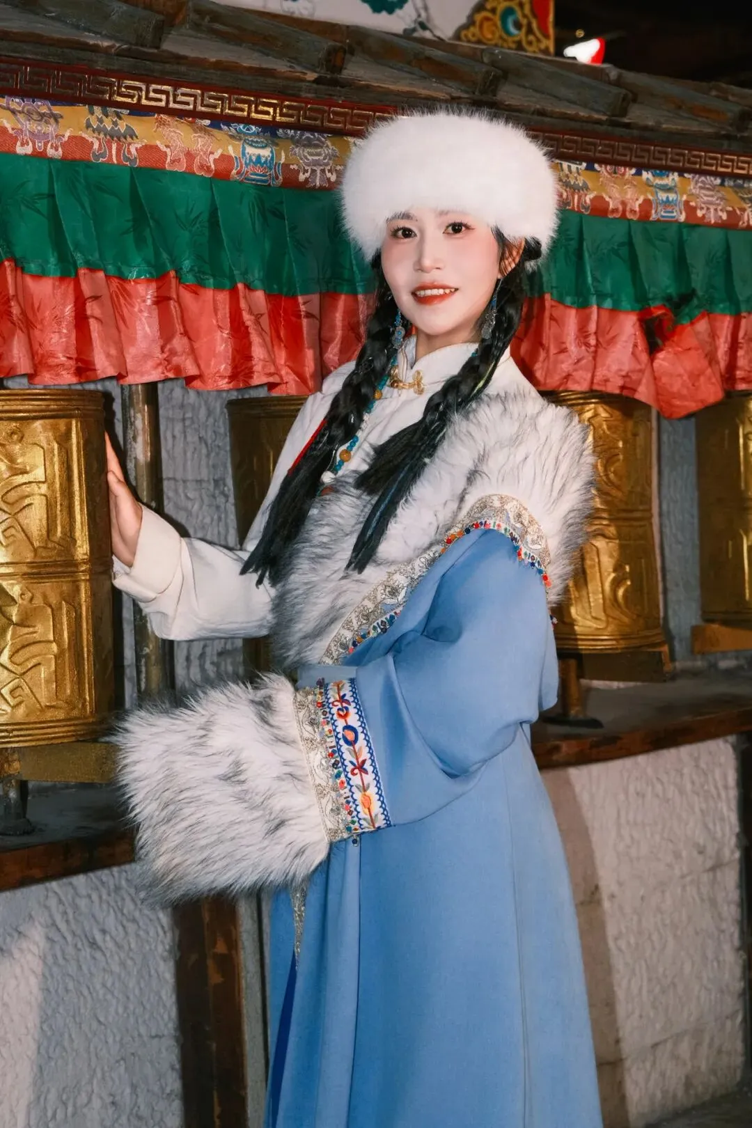 身披蓝色长袍,领口与袖口缀满繁复刺绣,洁白毛帽,如雪峰般纯净,蓬松的毛帽温柔包裹着笑意。