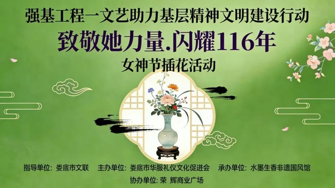 为深入推进强基工程— 文艺助力基层精神文明建设行动,传承中华优秀传统文化与非遗美学,丰富基层女性精神文化生活,展现新时代女性风采与巾帼力量,由娄底市文联指导,娄底市华服礼仪文化促进会主办,《水墨生香》国风非遗馆承办,荣辉商业广场协办的“致敬她力量・闪耀 116 年” 女神节国风插花活动即将优雅启幕。