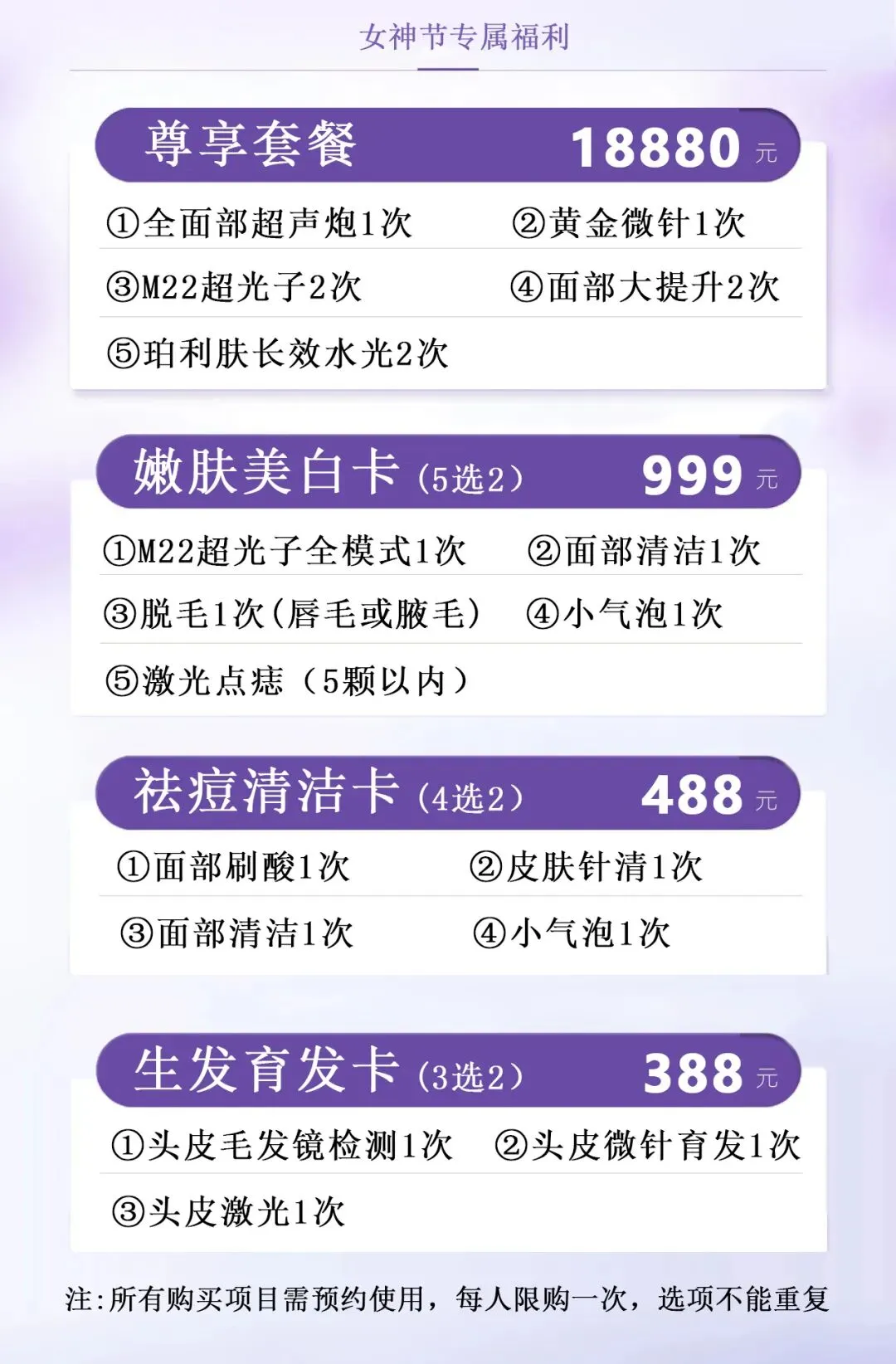 参加任意医学美容项目免费赠送智能皮肤检测一次;购买任意套餐,均额外加赠医用面膜+舒敏黄光治疗
