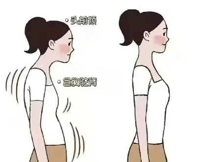 1. 圆肩驼背+头前伸:低头办公、刷手机导致,肩颈僵硬、富贵包、面部下垂;