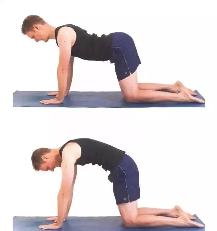 双手双膝撑地,吸气抬头塌腰,呼气含胸弓背,缓慢重复10次,放松整个腰背肌肉。
