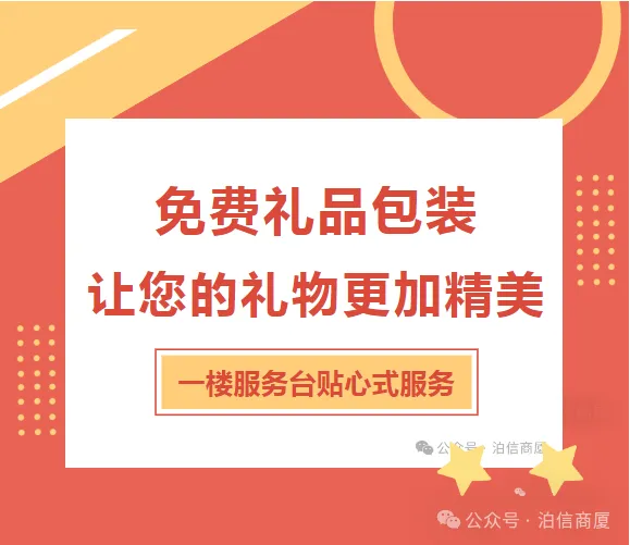 现在,赶快来到一楼服务台,体验我们的免费礼品包装服务吧!让我们的服务为您的礼物增添一份精美和温馨,让您的亲朋好友和客户感受到您的用心和关爱。泊信商厦与您共同打造美好生活!