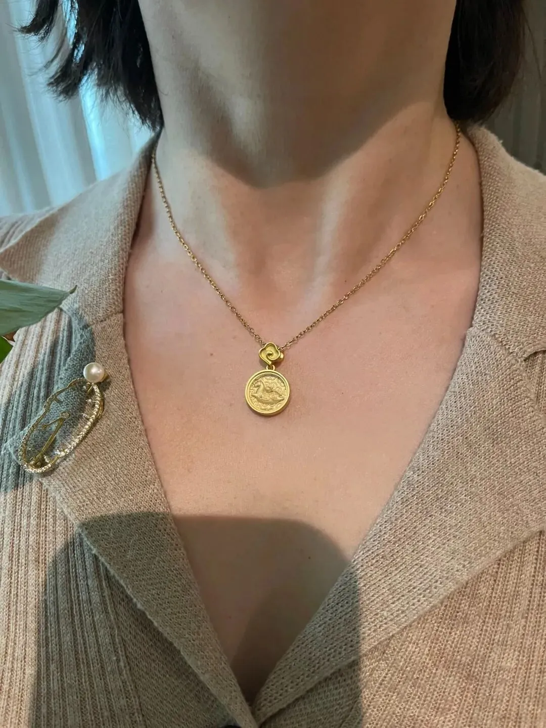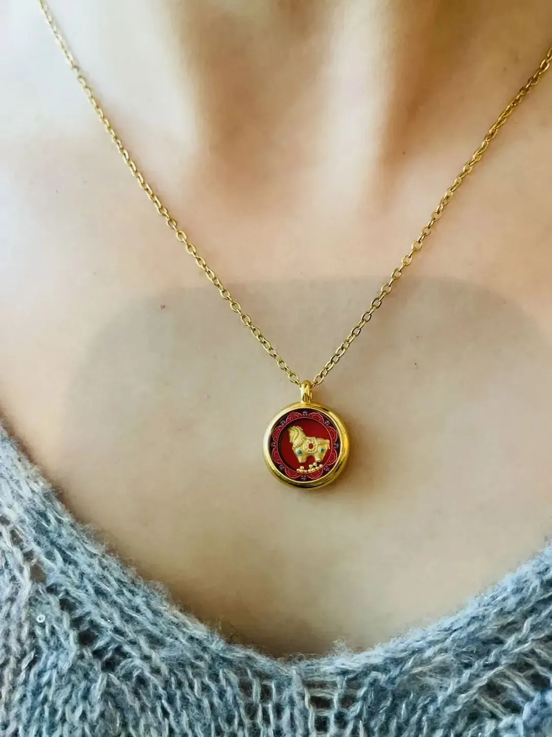 如意纹吊坠衔接经典圆形挂饰,内芯萌趣唐马四蹄腾空,马背驮载金元宝,暗藏“马上有钱”的吉祥愿景;
