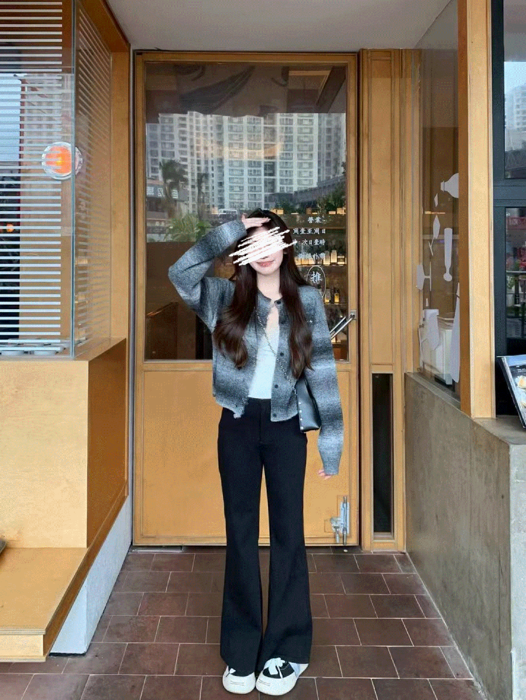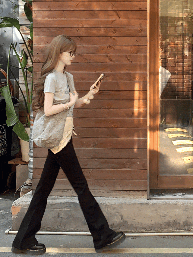 想修饰身形,其实更适合微喇裤这种“正三角”裤型,视觉重心往下移,裤脚悄悄放开,胯宽瞬间被平衡,整个人都显得轻盈舒展啦