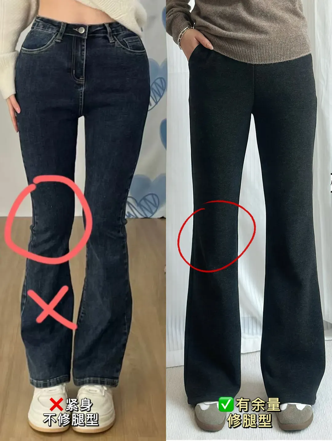 其实经典的喇叭裤为了突出曲线美,腰腹大腿都会收得很紧,像我这种大腿略粗的人穿起来就是这种紧绷勒肉的效果▼
