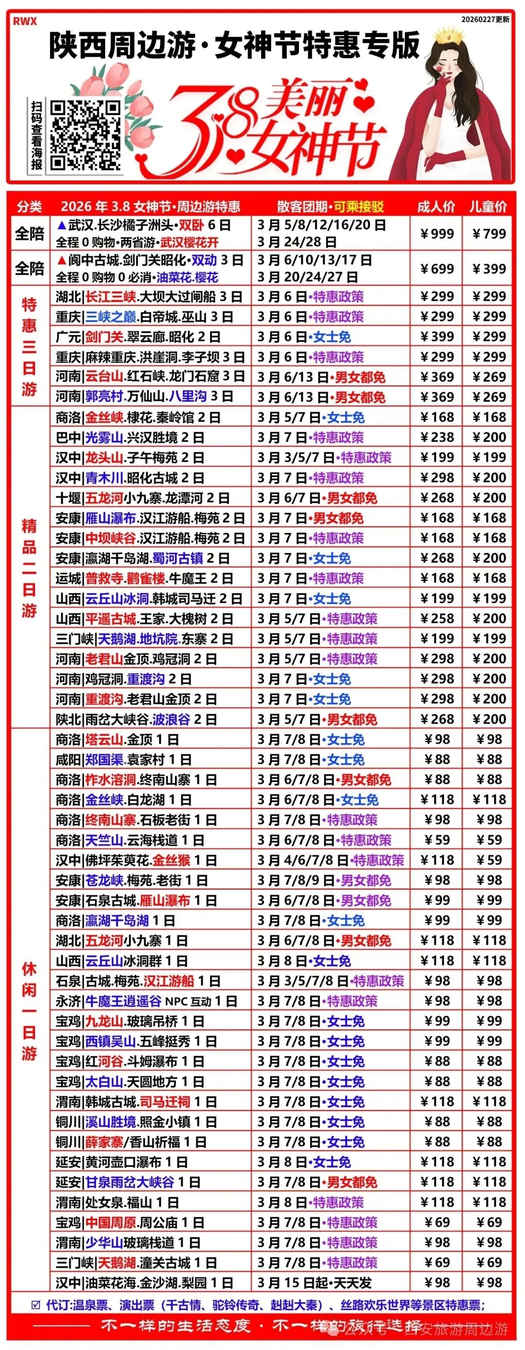 政策:全国女性游客免景区门票,随行男士享门票半价(不含保险、景交车及其他二次消费)。