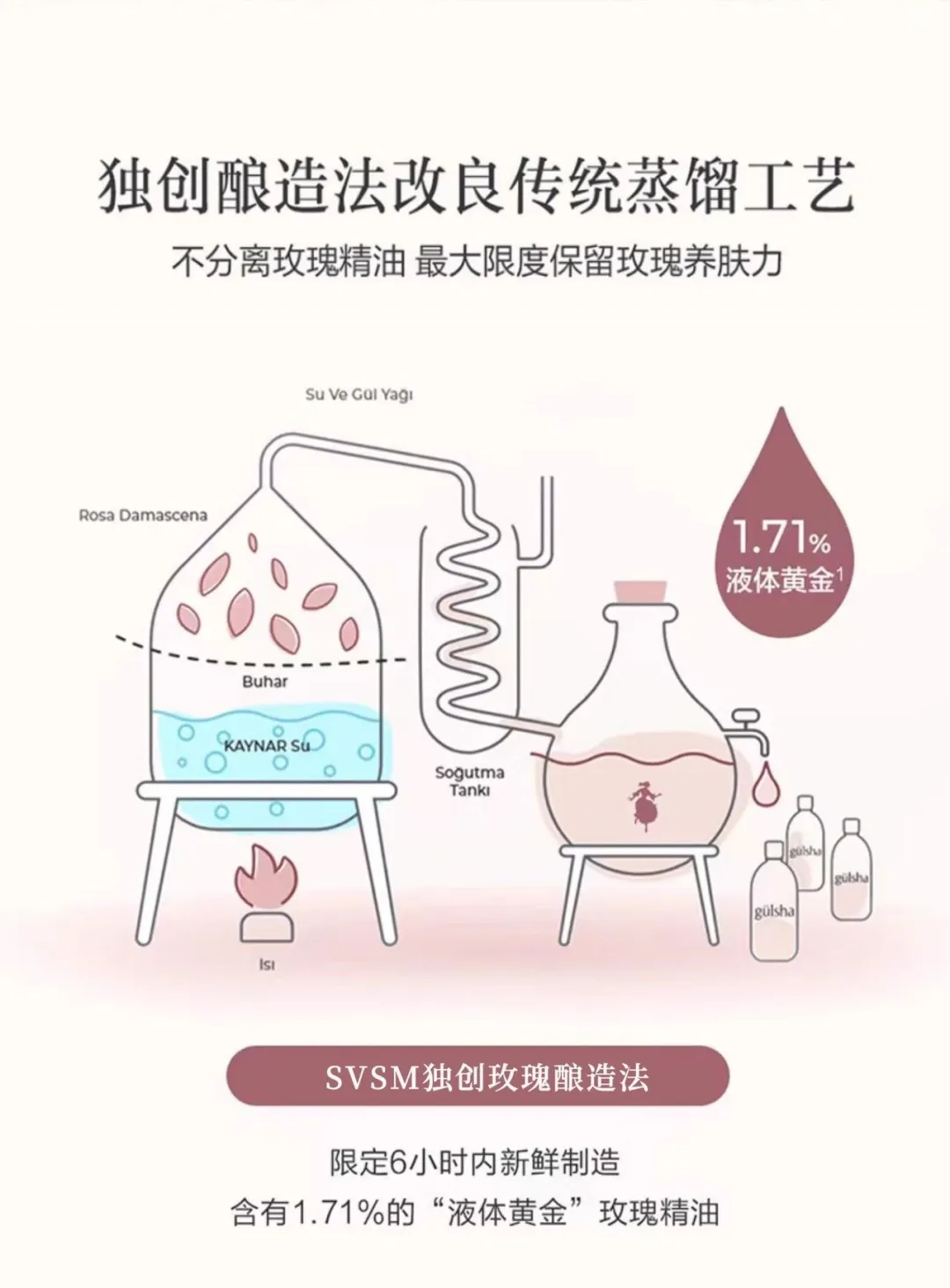其次,svsm纯露在制作过程中不分离玫瑰精油,并通过繁复蒸馏工艺只为那一捧凝露,取头道蒸汽冷凝水留存高浓度玫瑰精华,可达1.17%!比普通纯露高5倍!