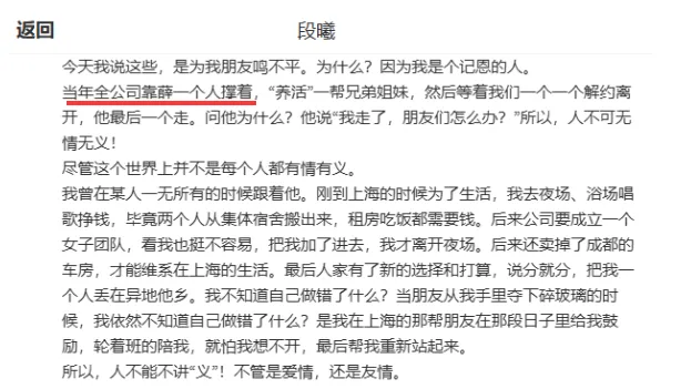 段曦也参加了2004年的《我型我秀》,拿下全国16强,进了女团JADE,和她长文的内容是对得上的。她撑薛之谦,主要是说薛之谦进上腾之后一人奶全公司,“养活”一帮兄弟姐妹,熬到合约到期才走。