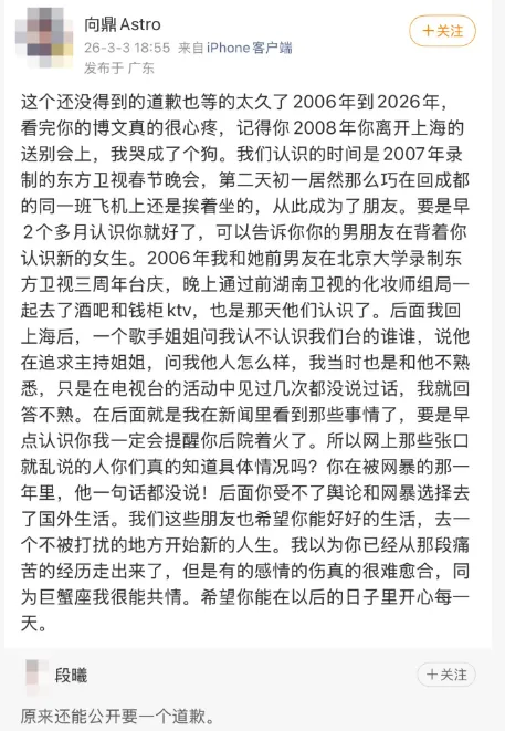 段曦的长文,引来好友向鼎转发,向鼎提到“你的男朋友在背着你认识新的女生”,但没指名道姓。