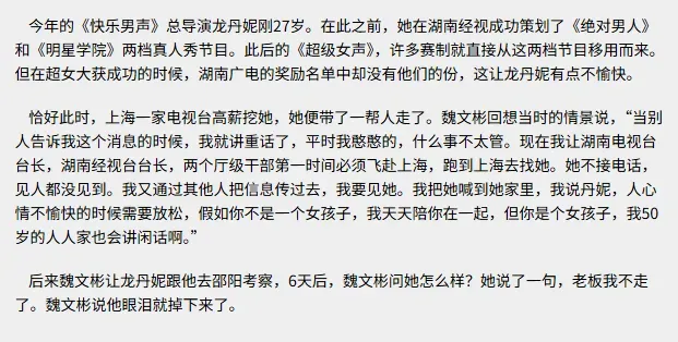 龙丹妮一走,最着急的,是当时湖南台的老台长魏文彬,这位台长本来就很支持台里搞创新,龙丹妮的《幸运3721》和《明星学院》都是他看中的“综艺潜力股”。