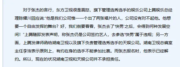 争议点在于张杰还有合约在身呢,单方面提解约去参赛,东方卫视自是震怒。