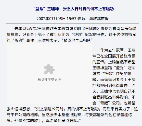 连带06年型秀冠军王啸坤也要站队发言:张杰入行时谈不上有唱功,希望他早点归队。