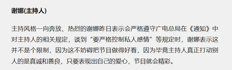 谢娜在这个新闻里也回应了,表示“严格控制私人感情”这种规定不是限制,不妨碍把节目做得好看。