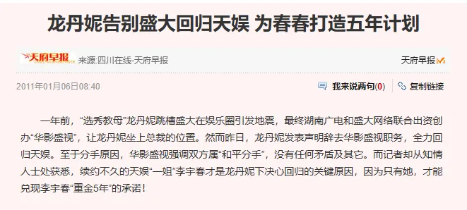 但在2011年,龙丹妮还是为了续约的李宇春,再回归到天娱。