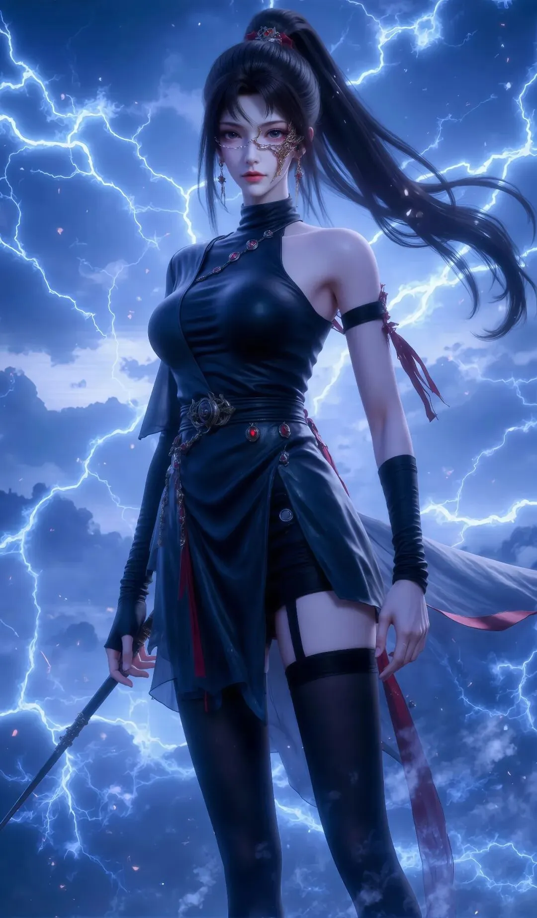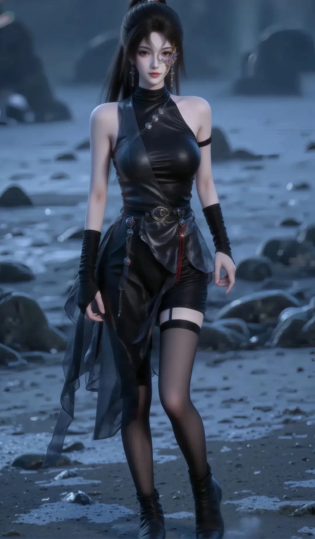 眉心处的青色云纹被淡淡的血色纹路覆盖,是与罗异阁契约的印记,也是她修为本事提升的象征,催动力量时,血色纹路会蔓延至脸颊,更添魔性气场[3]。鼻梁高挺立体,唇形依旧饱满,却极少再展露笑容,唇色恢复为自然的粉豆沙色,唯有在复仇得手时,会勾起一抹冰冷的弧度,宛如地狱归来的修罗[2][3]。长发被高高束成战马尾,用银色发带紧紧缠绕,利落干练,便于战斗,发间插着一支镶有黑宝石的银钗,锋利如刃,既能固定发丝,又能作为暗器使用,彻底褪去了往日的温婉装饰[3]。此时的她,冷艳而致命,凌厉而决绝,每一处细节都透着复仇者的锋芒,却在深处,依旧藏着一丝未被仇恨磨灭的善意[2][3]。