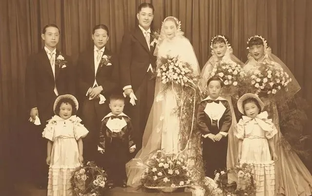 这张婚礼合影铺排得满,男宾女伴排成一字,花球像一片小树林,孩子们衣服硬得打折,礼帽短袖并排站,那会儿婚礼要体面,站位讲究中间高两边低,一眼就看出主角是谁。