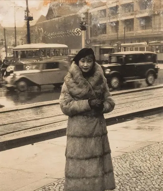 这一张在街口,长皮草裹到脚背,手里绒手套,后面电车和小轿车一串串过,雨后路面反光,帽檐压在眉上,她站在风里不急不忙,以前穿皮草要挨人看,现在羽绒服上街谁也不回头了。